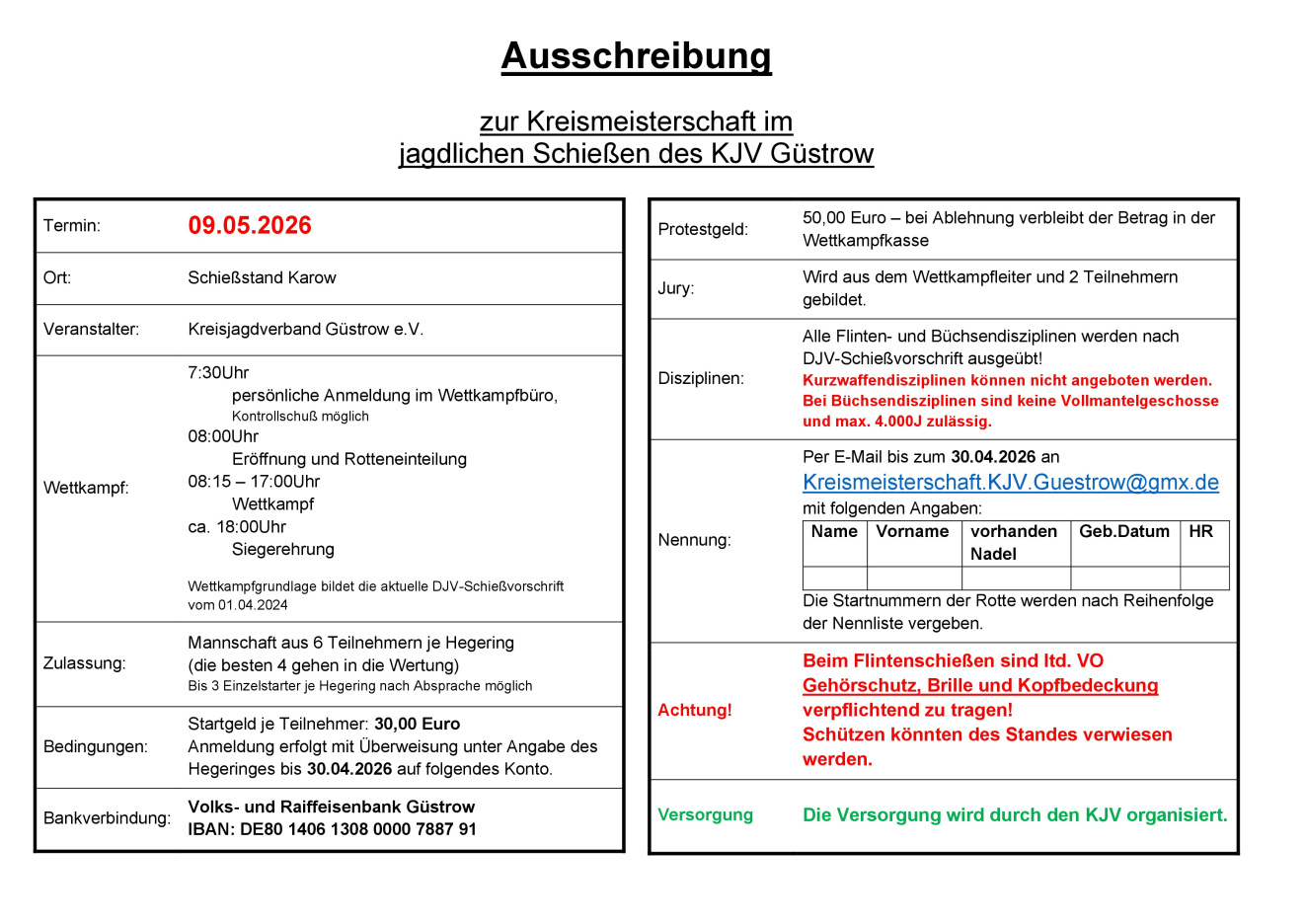KJV Güstrow am 09.05.2026 / KJV Rostock am 30.05.2026 Beginn jeweils 8:00Uhr